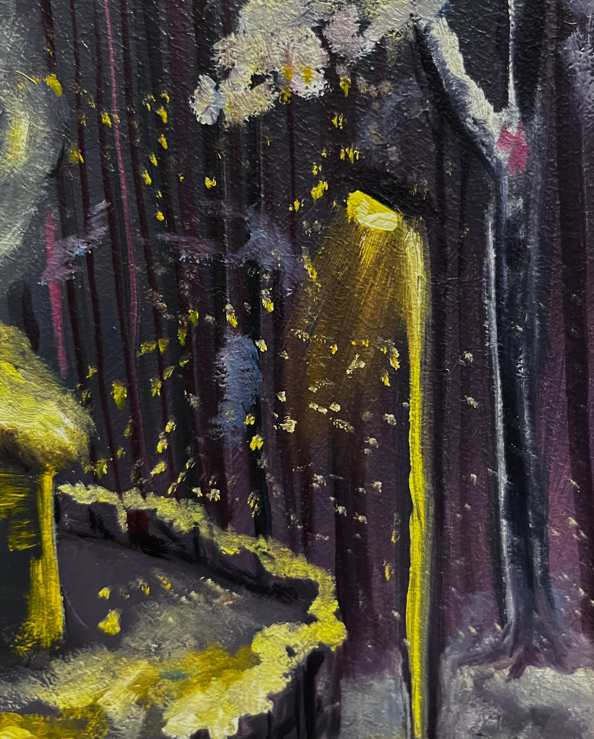 This artwork portrays the stillness of a winter night, while the soft illumination creates a romantic yet somber mood. The falling snowflakes add a touch of sharpness. A solitary cabin, nestled in the woods, emanates an inviting soft light, enveloping the atmosphere with sadness.